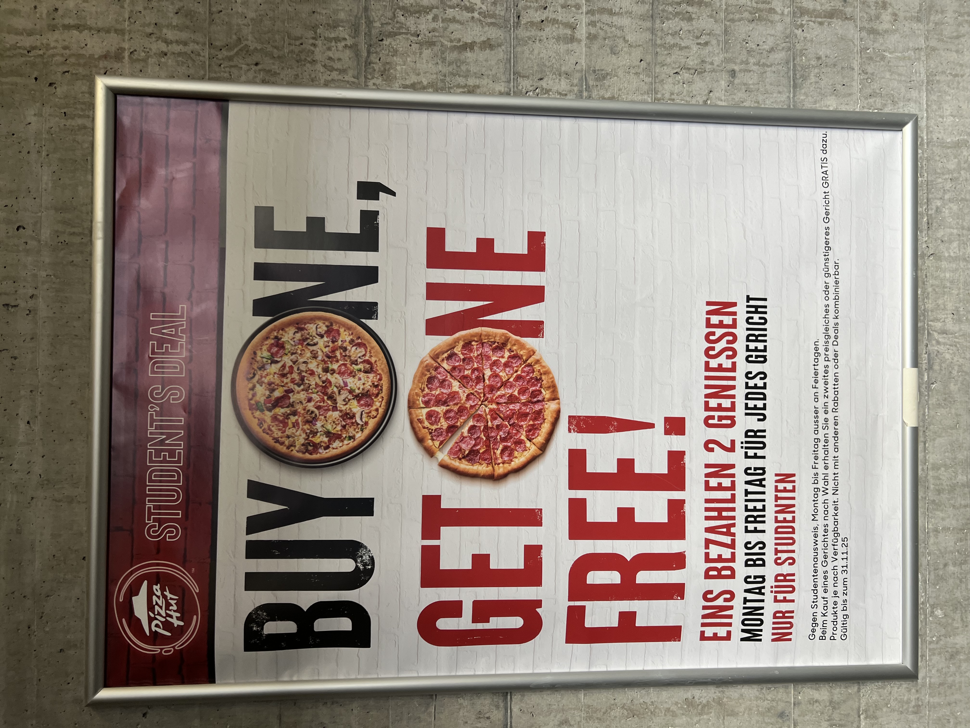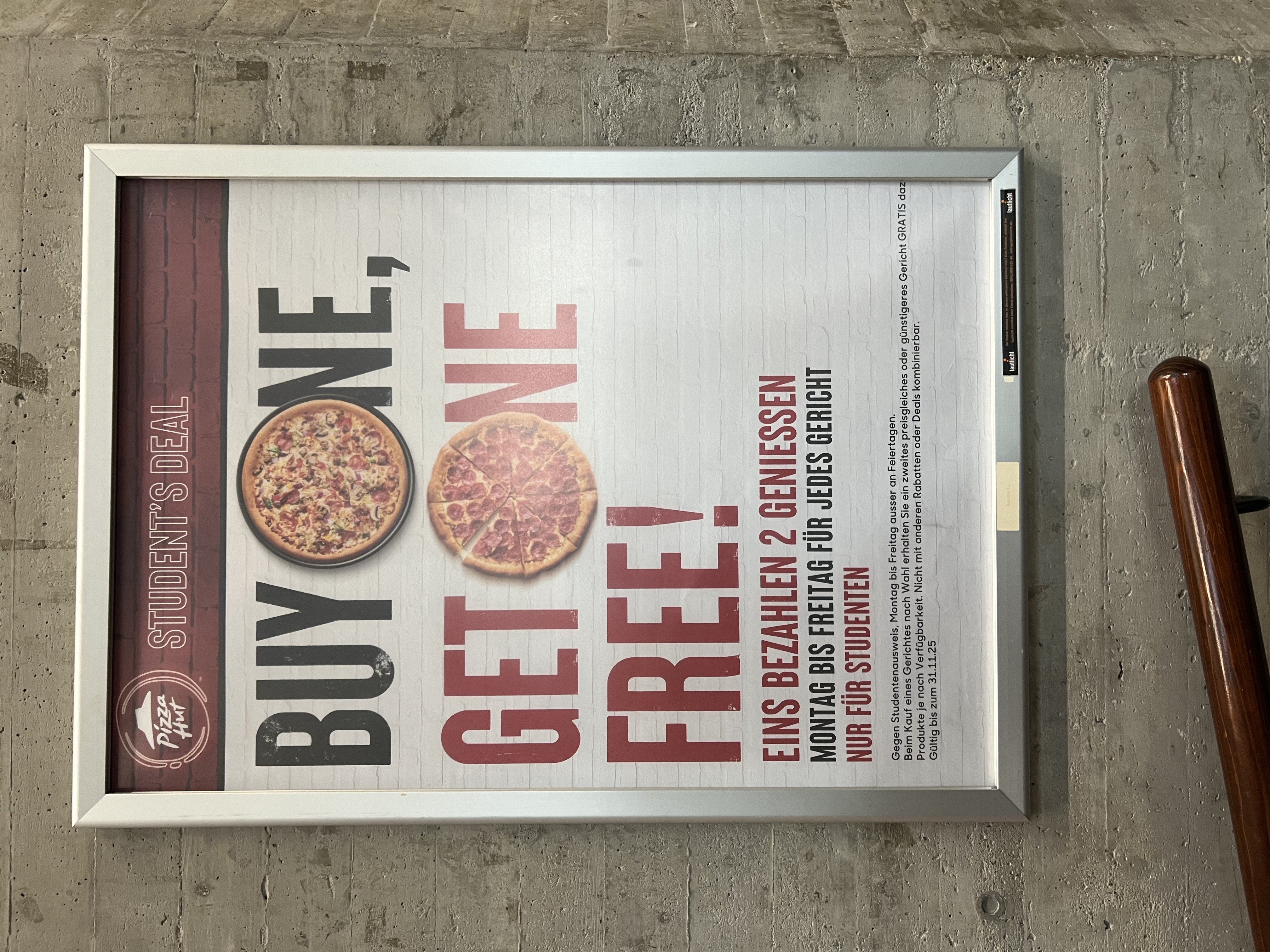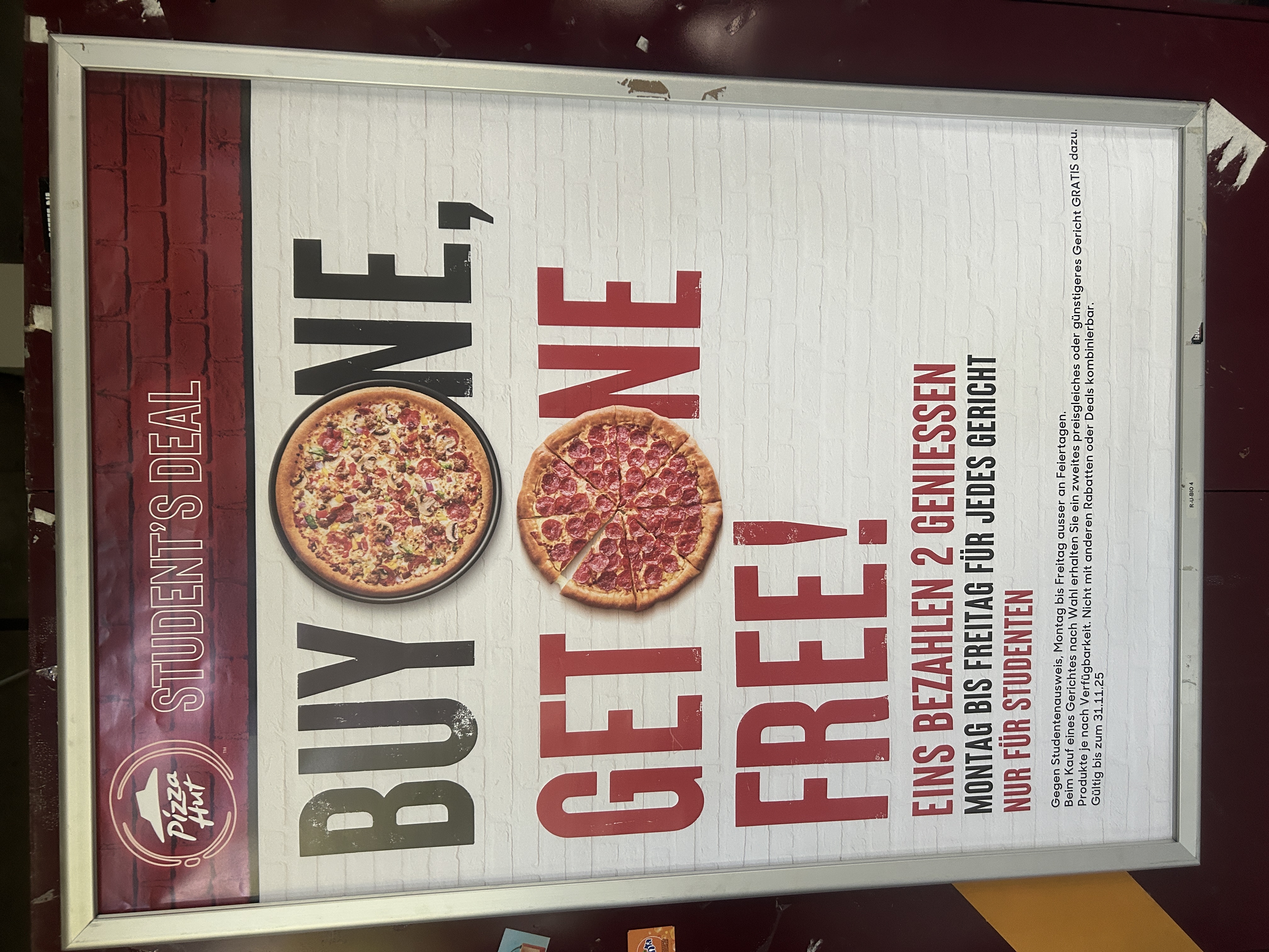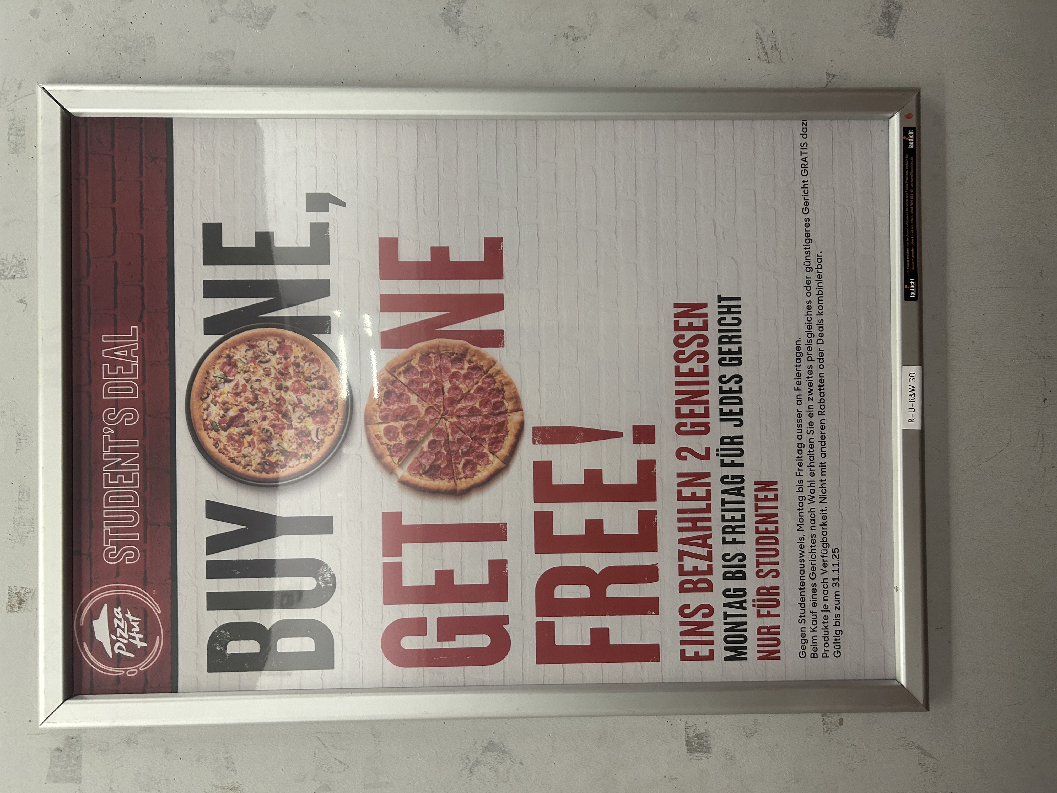 R-U-R&W 30 | DIN A0 | Pizza Hut | Lautlicht | Buy one, get one free! | Bibliothek Recht & Wirtschaft | 13.10.2025 | 31.03.2026 | |